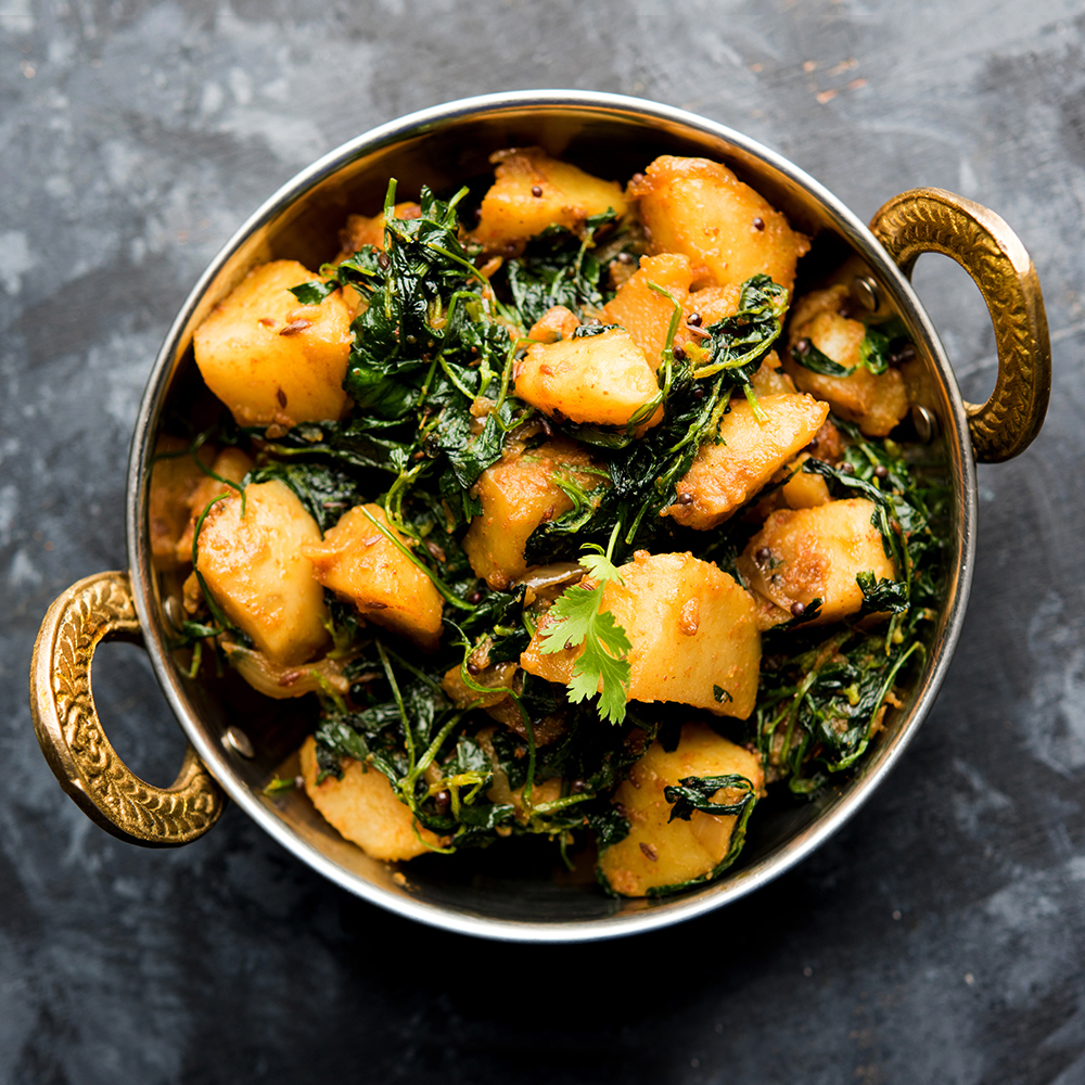 Potatoes cooked with fenugreek leaves and spices, offering a delightful combination of earthy flavours.