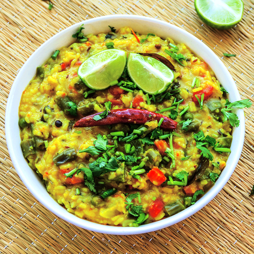 A wholesome and nutritious one-pot meal made by cooking rice and lentils together with a variety of fresh seasonal vegetables.