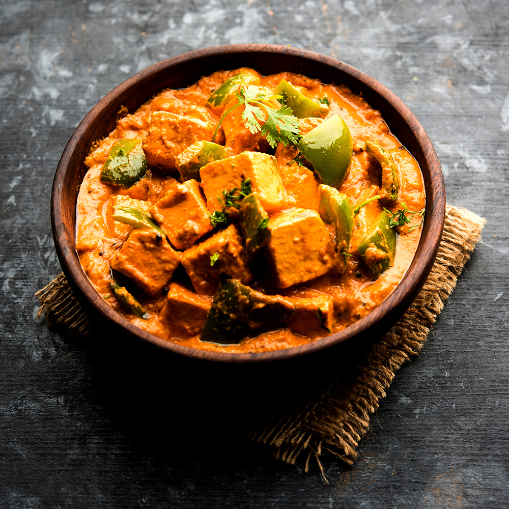 Paneer cubes marinated in a spiced yogurt-based marinade and Achaar and cooked in a special sattvik cashew nut gravy.