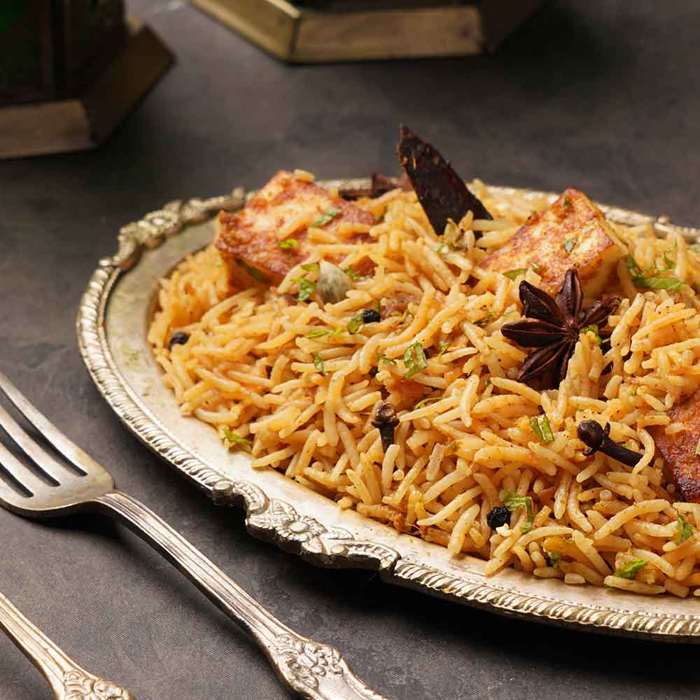 Aromatic vegetarian biryani with succulent paneer tikka, cooked in a traditional dum.
