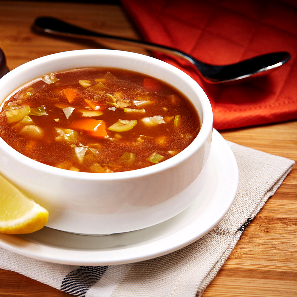 A tangy and spicy soup made with vegetables flavored with vinegar, soy and chilli sauce.