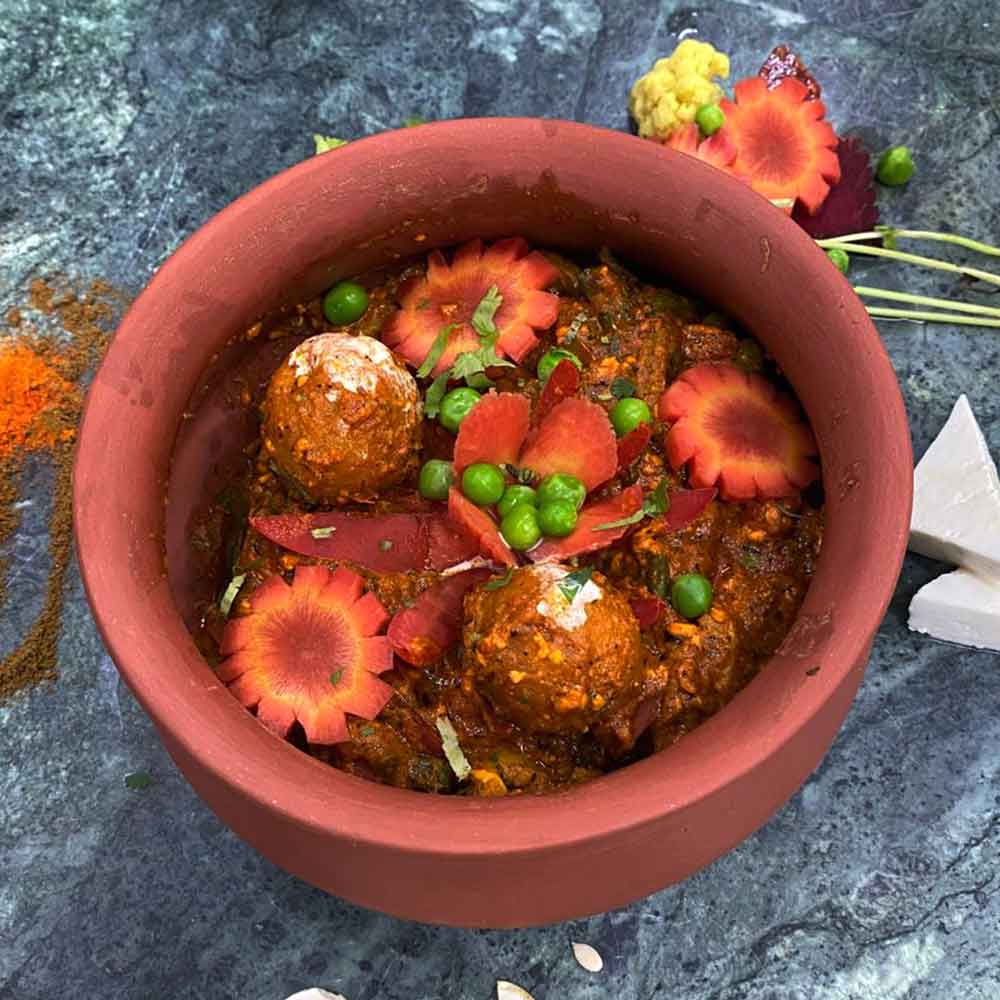 Finger cut fried vegetables with two paneer koftas cooked in a special home made sattvik gravy.