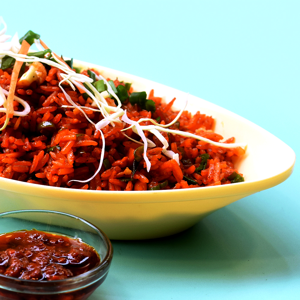A blend of colorful vegetables, fragrant rice, and spicy schezwan sauce.